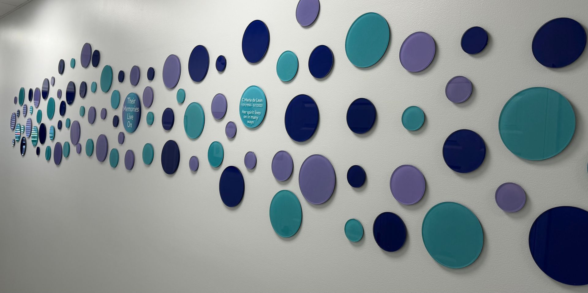 Families and friends are invited to honor a loved one by purchasing an acrylic circle to be displayed on the wall. Each circle will be thoughtfully arranged in a mix of three beautiful colors: lavender, aqua, and indigo (deep purple/navy) to create a serene and uplifting display.
